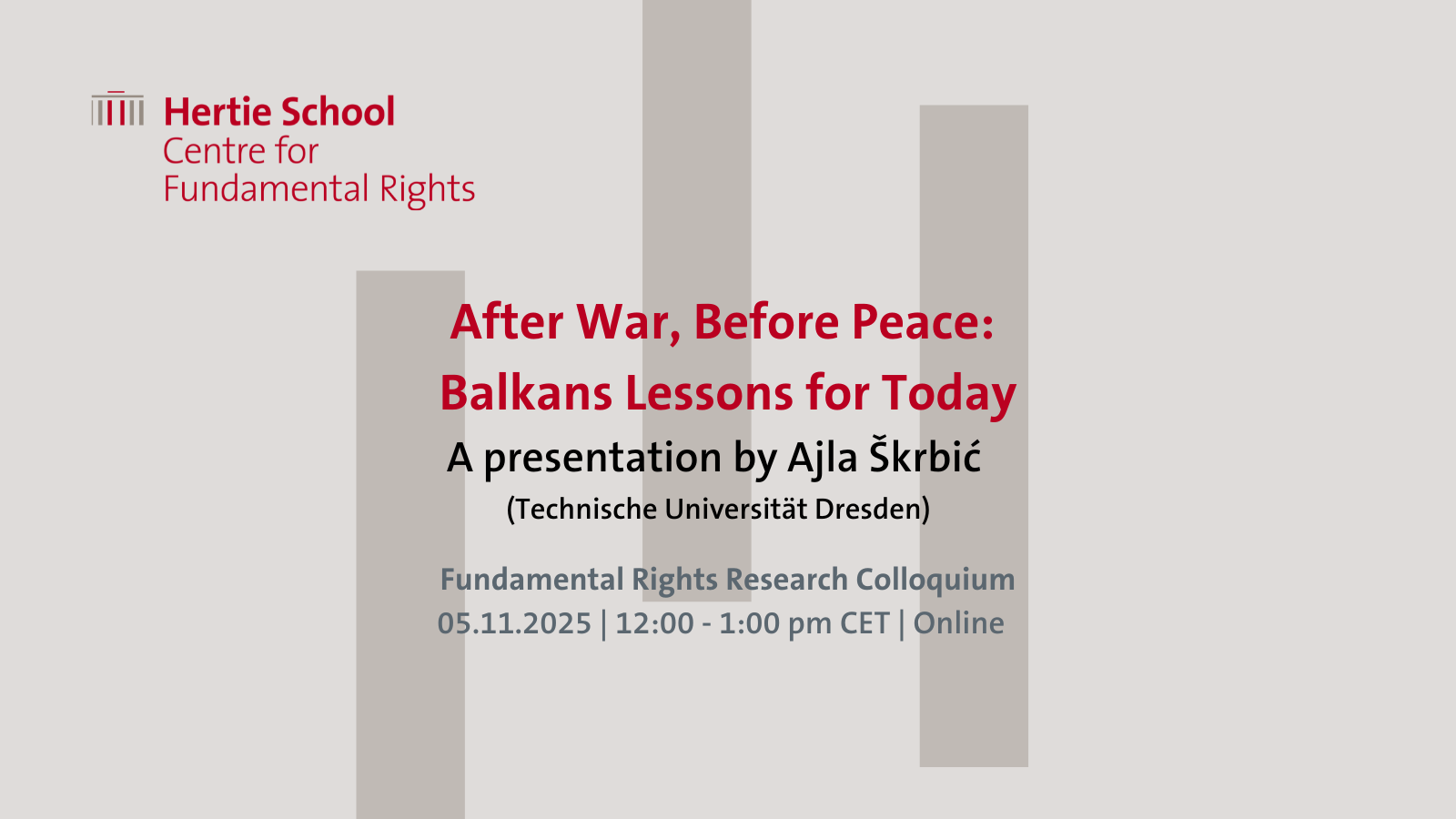 A presentation by Ajla Škrbić, Technische Universität Dresden. This event is part of the Fundamental Rights Research Colloquium under the "Human Rights in Times of War" cluster hosted by the Centre for Fundamental Rights.