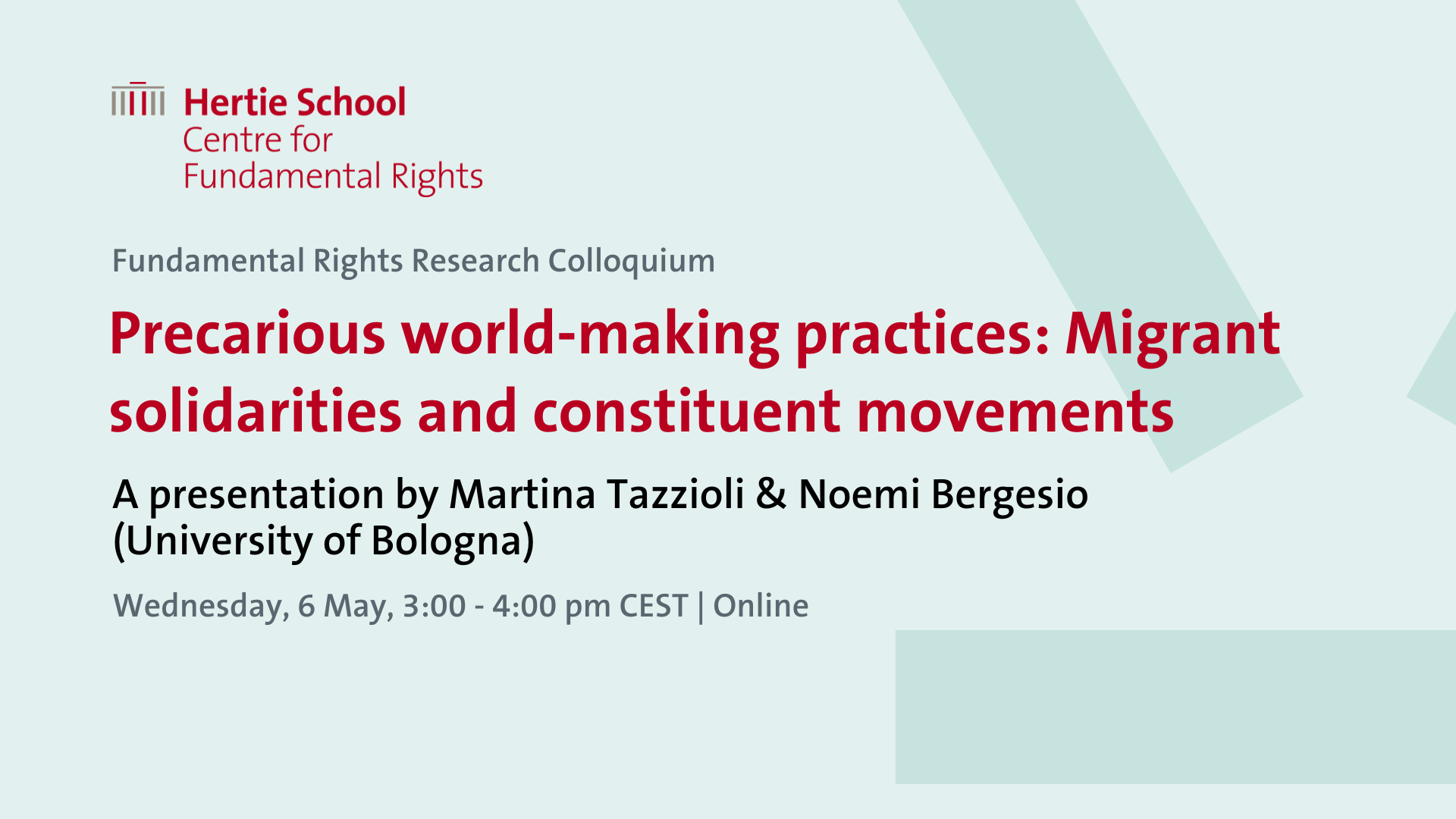 A presentation by Martina Tazzioli and Noemi Bergesio, University of Bologna. This event is part of the Fundamental Rights Research Colloquium under the "Transforming Migration Governance: Towards a Solidarity-based Approach" cluster hosted by the Centre for Fundamental Rights.