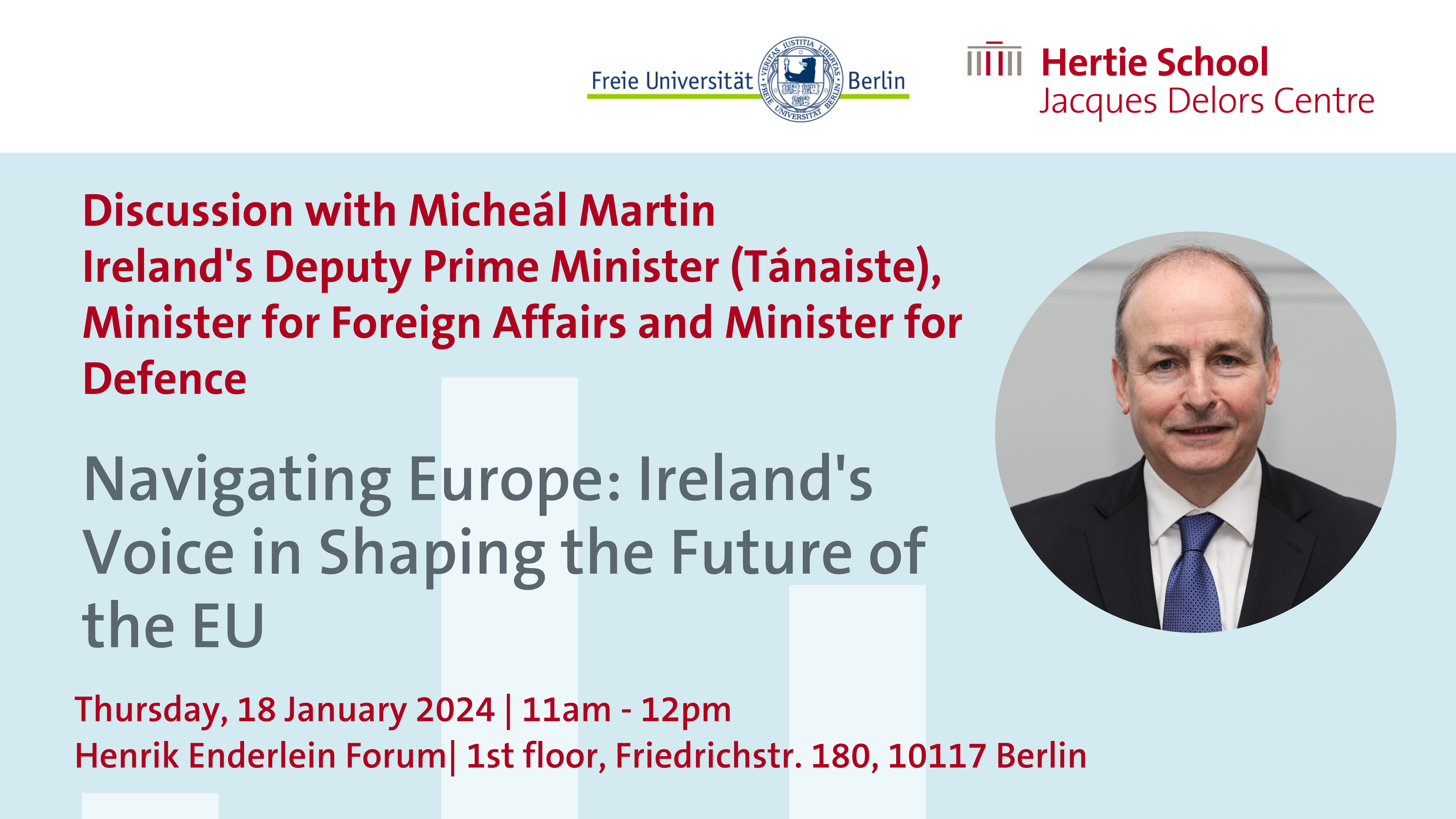 On 18 January, from 11:00am - 12:00pm, we are very pleased to welcome MicheƔl Martin, Ireland's Minister for Foreign Affairs and Defence to the Hertie School to discuss "Navigating Europe: Ireland's voice in shaping the Future of the EU". Co-hosted by the Free University of Berlin.