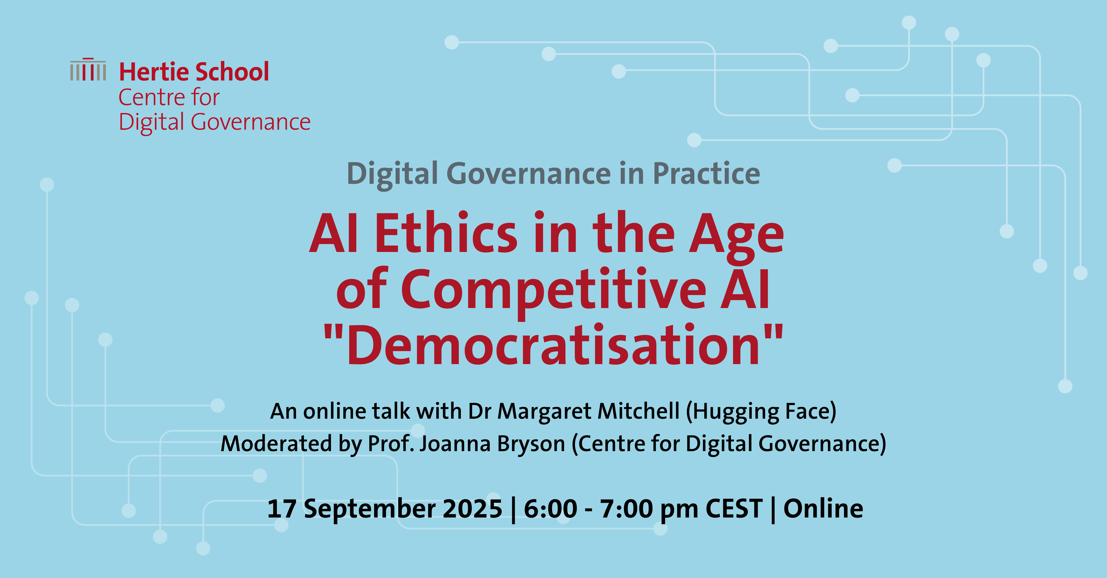 Join us for an event from the "Digital Governance in Practice" series with Dr Margaret Mitchell, moderated by Prof. Joanna Bryson. This event is hosted by the Centre for Digital Governance.